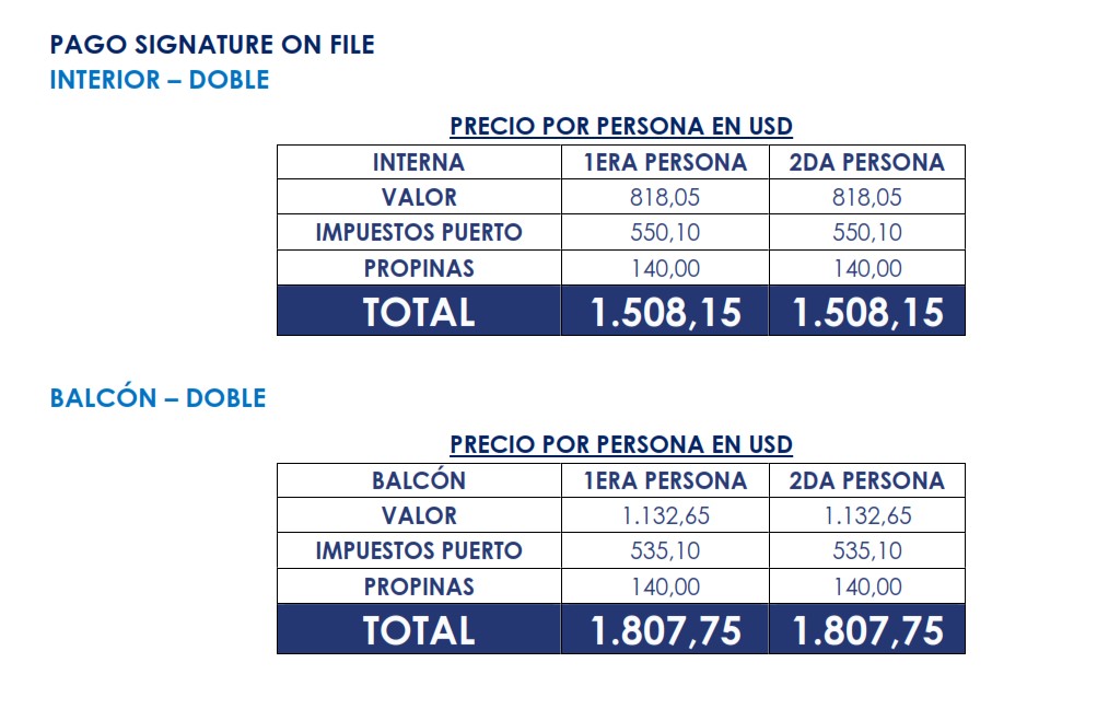 2do pasajero. Solo recibe 2 beneficios – Cabina Balcón: 2 cenas de especialidad para 1er y 2do